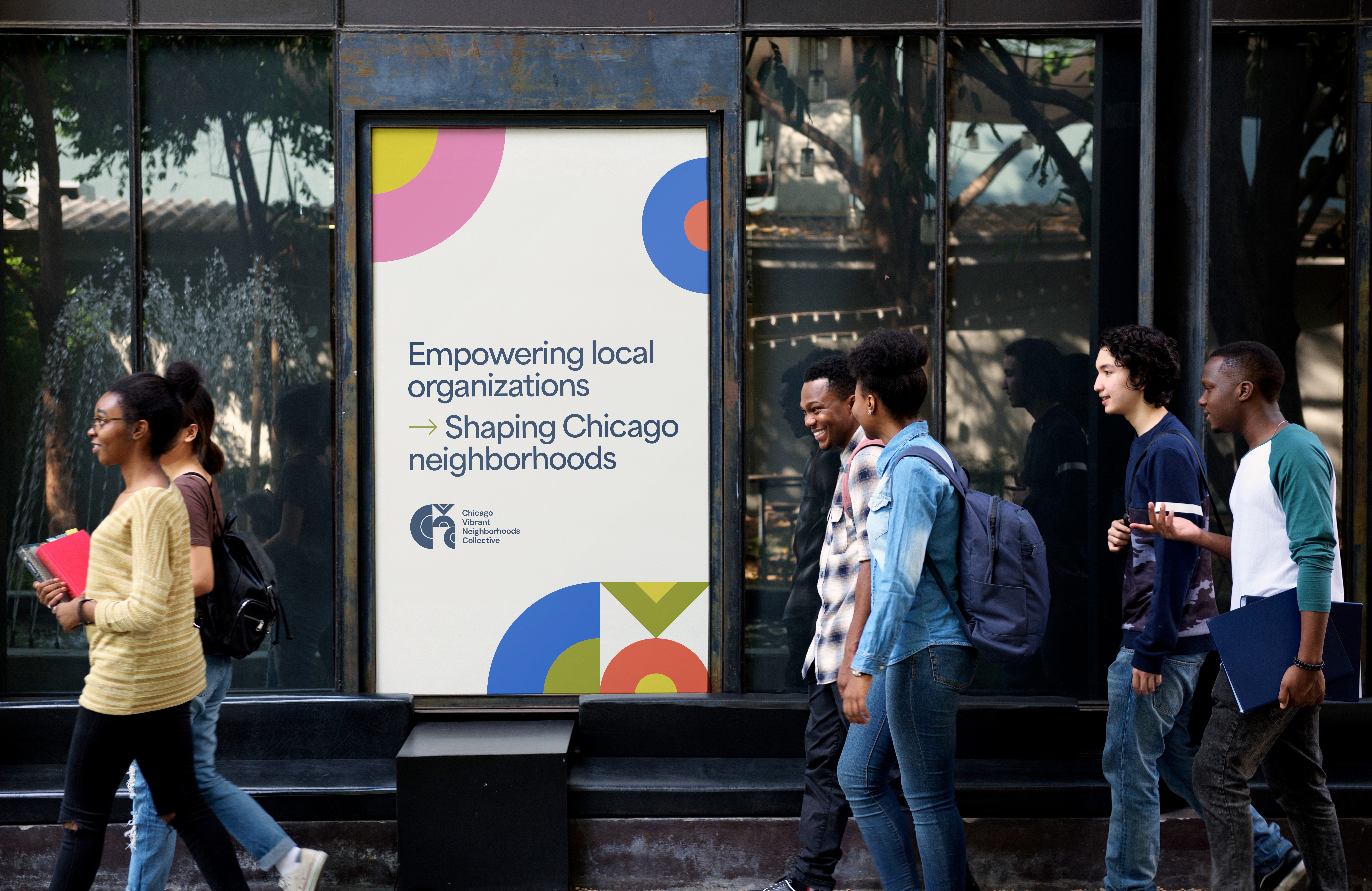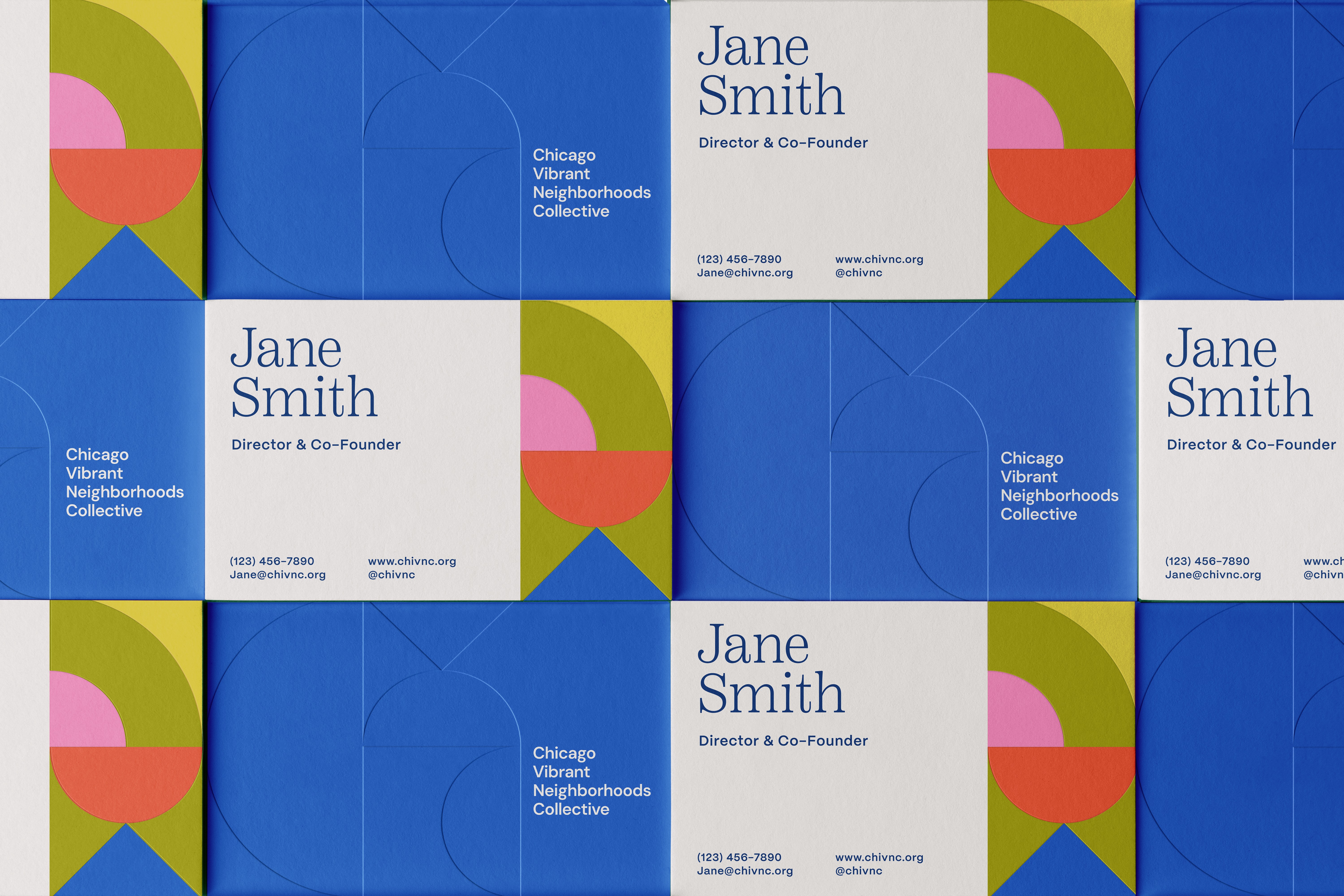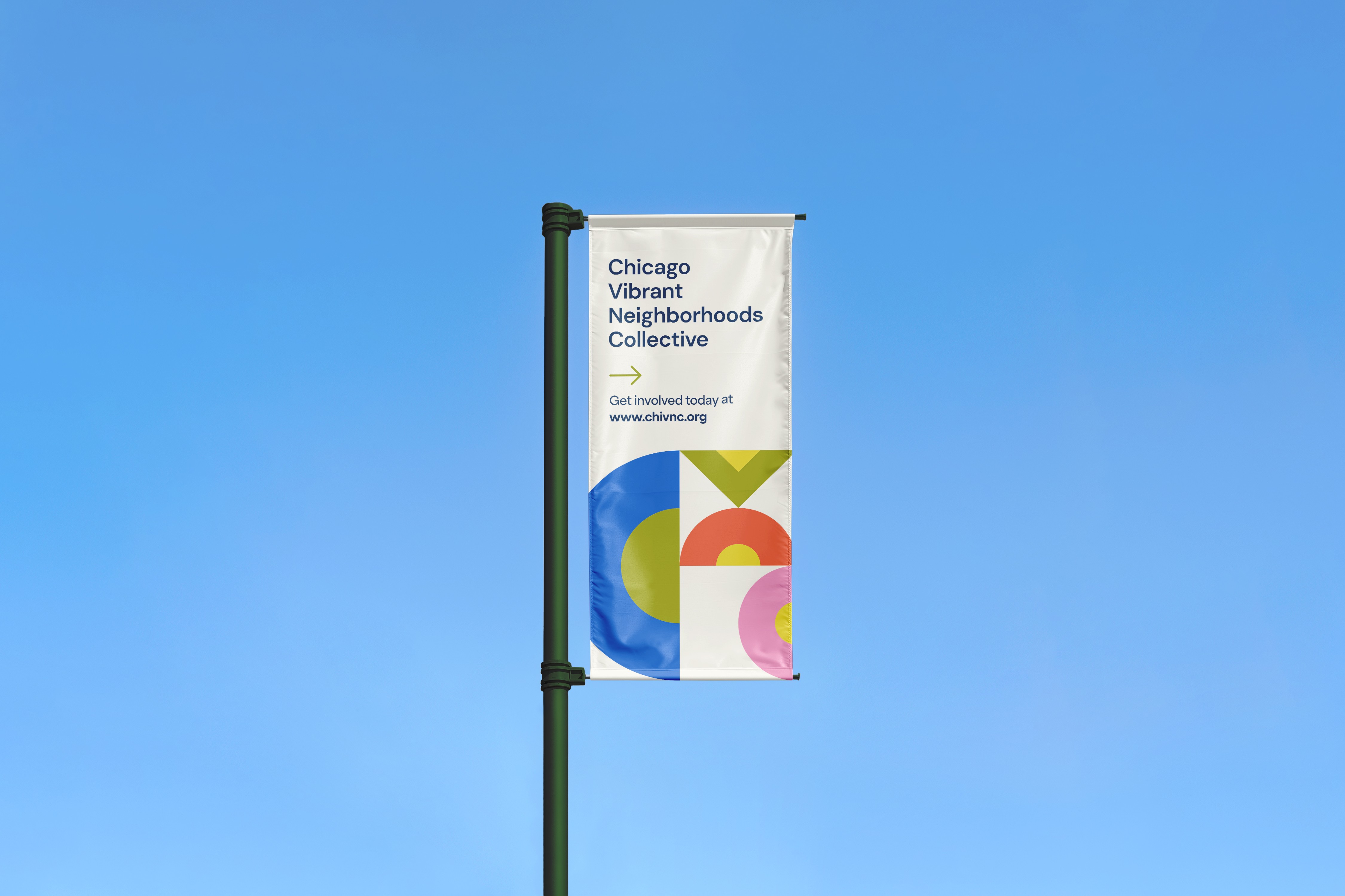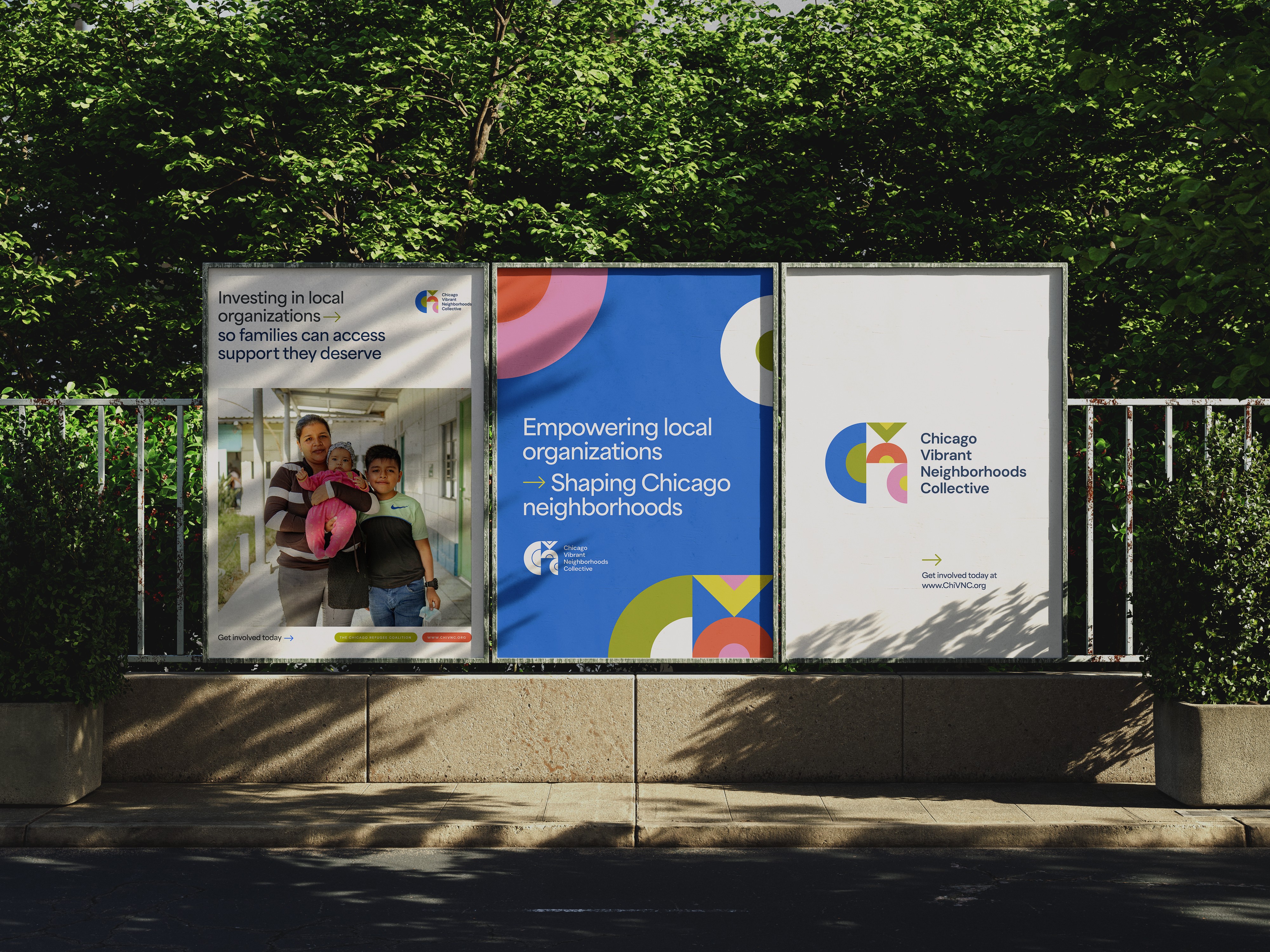 Chicago Vibrant Neighborhoods Collective (CVNC) is a local organization that empowers community-based nonprofits across historically disinvested Chicago neighborhoods by offering free capacity-building services—ranging from finance, data systems, and fundraising to marketing, board development, and beyond—to boost their long-term sustainability and collective impact. The new identity, inspired by their bold initiatives and communal focus, leans into modular and colorful geometric forms that weave together like a neighborhood map forming a cohesive whole—symbolizing CVNC’s co-designed, strength-based approach and their dedication to equity, collaboration, and neighborhood-led resilience. Through an energetic, hopeful, and grounded palette combined with simple balanced shapes, the logo remains flexible to work small for swag and digital use, or large as a supergraphic – creating a distinct voice that can speak loudly to the community, or calmly to come together to build trust, spark innovation, and create vibrant, healthy neighborhoods citywide.